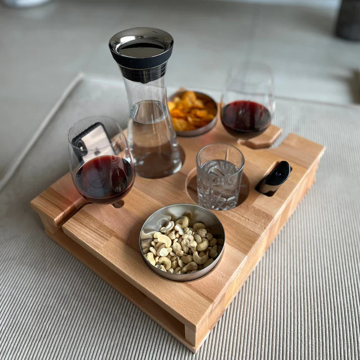 Its smart design includes dedicated cut-outs for wine glasses, cups, snacks, and even your remote, ensuring everything stays organized and spill-free.